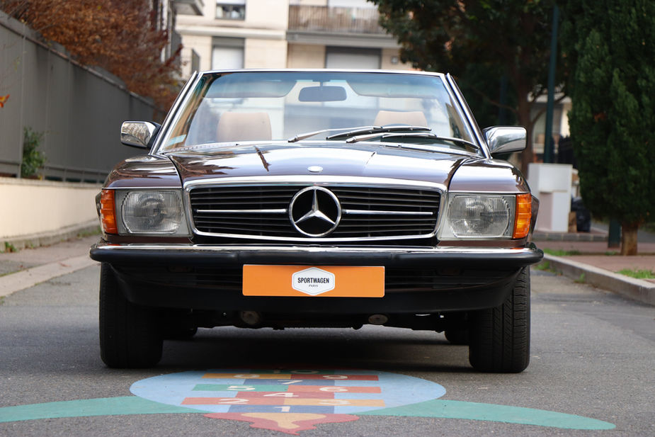 Cette Mercedes 380SL (type w107) est dans une très belle configuration marron (Brun manganèse – code 480) et un intérieur Palomino (code 134).
